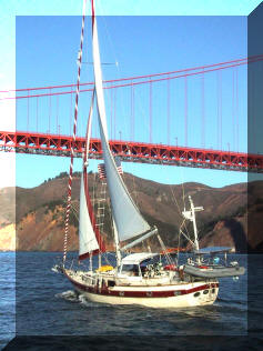 below is a picture of siesta about to sail under the golden gate bridge on september of 2001, on its way south to mexico. photo courtesy of dave and marie caradonna.